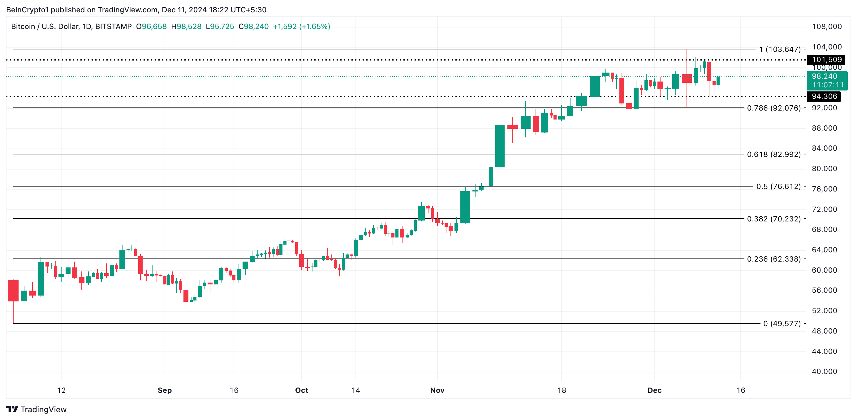 Bitcoinin hinta on pysynyt kapealla alueella sen jälkeen, kun se saavutti uuden kaikkien aikojen ennätyksen 103 647 dollaria 5. joulukuuta. Sen jälkeen se on kohdannut vastustusta 101 509 dollarissa ja löytänyt tukea 94 306 dollarissa.