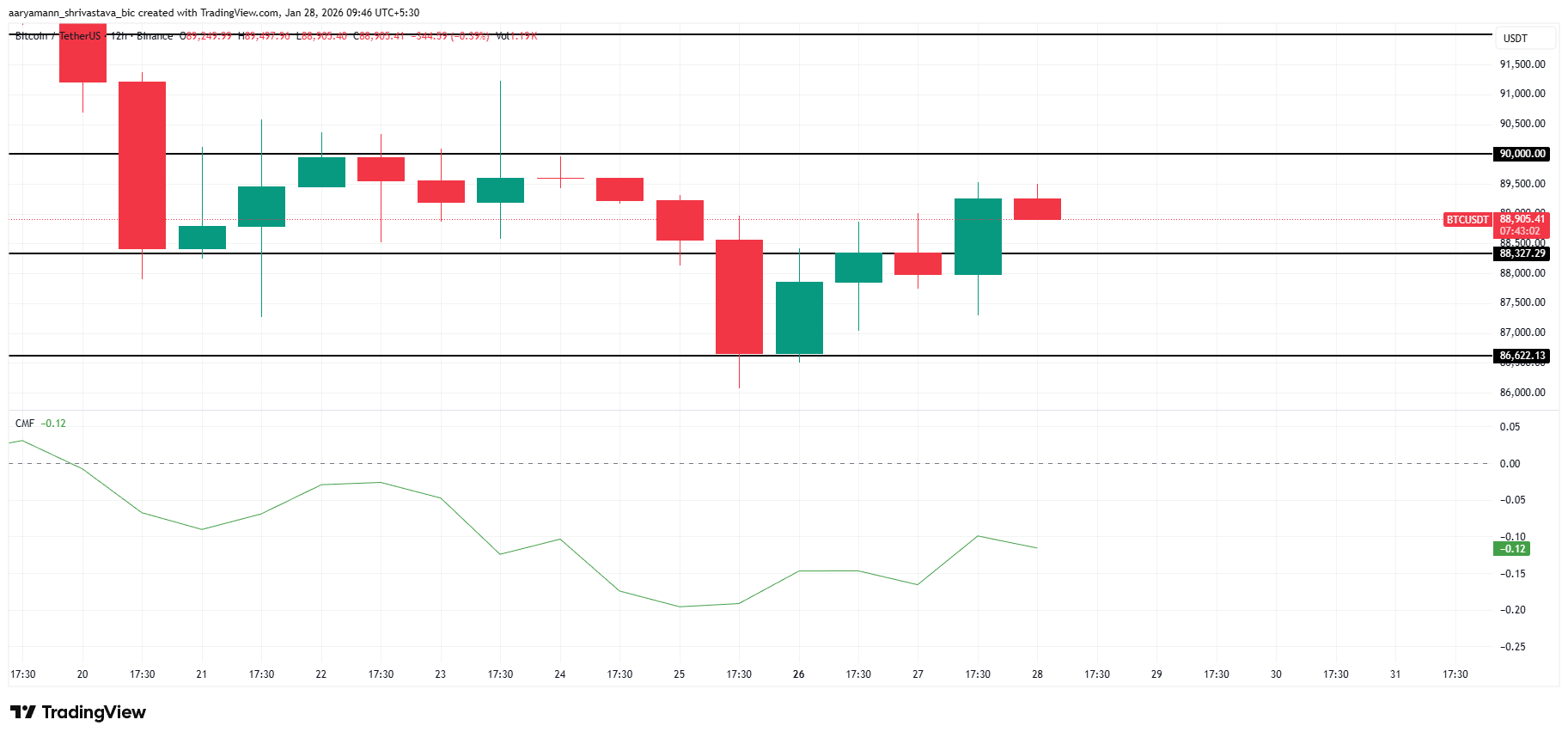 Bitcoin käy kauppaa lähellä 88 905 dollaria kirjoitushetkellä ja liikkui välillä 90 000–88 327 dollaria. Tämä alue on toiminut aiemmin pysähdysvyöhykkeenä ennen selvempää suuntaliikettä. Hintavakaus viestii siitä, että markkina odottaa selkeämpiä signaaleja ennen läpimurtoa tai uuden laskun aloittamista.