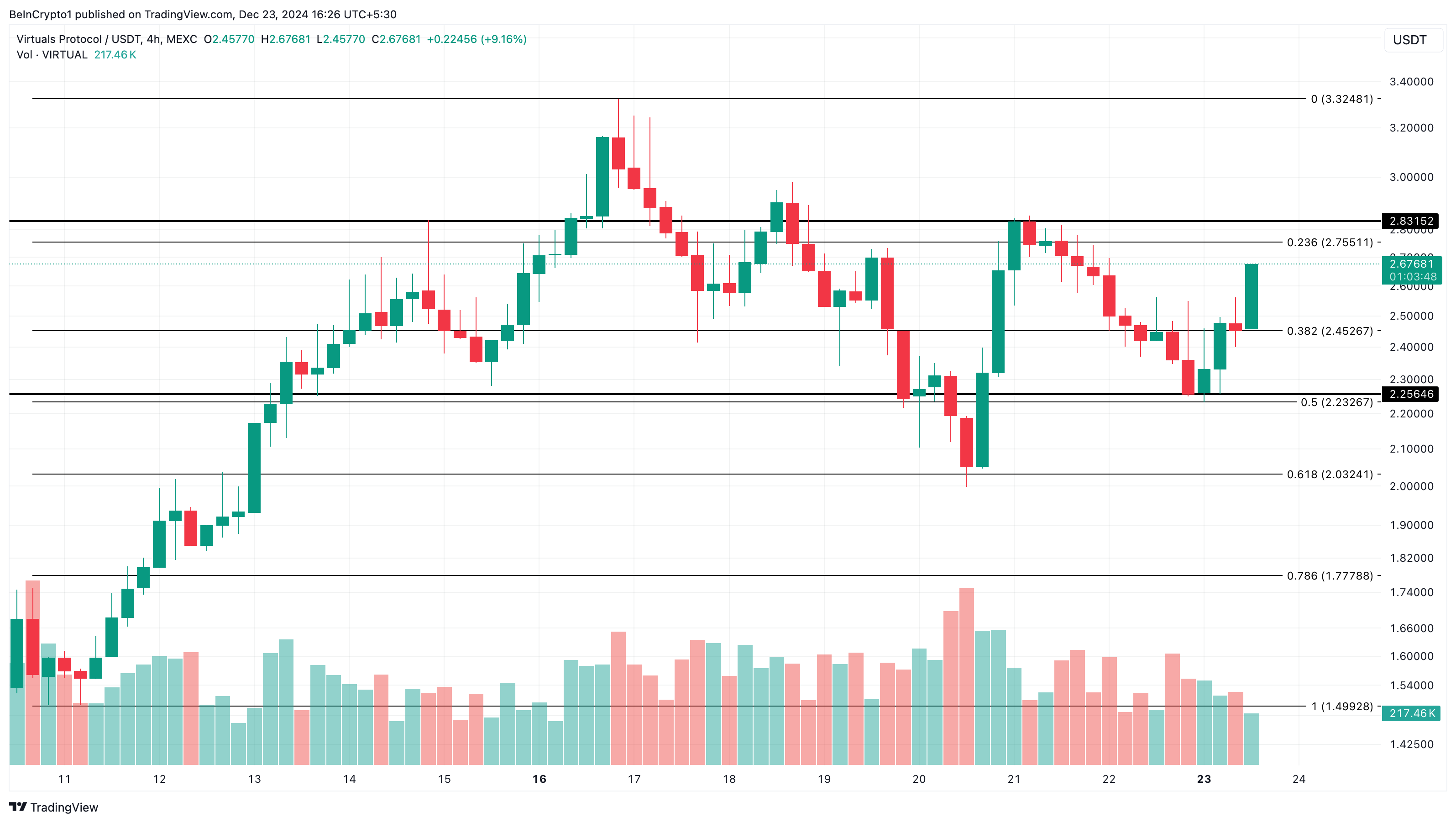 4-tunnin kaaviossa altcoin koki tämän palautuksen, kun härät puolustivat tukea 2,25 dollarissa. Tämän vuoksi kryptovaluutan arvo on noussut 2,67 dollariin. VIRTUAL saattaa kuitenkin kohdata vastuksen 2,83 dollarissa.