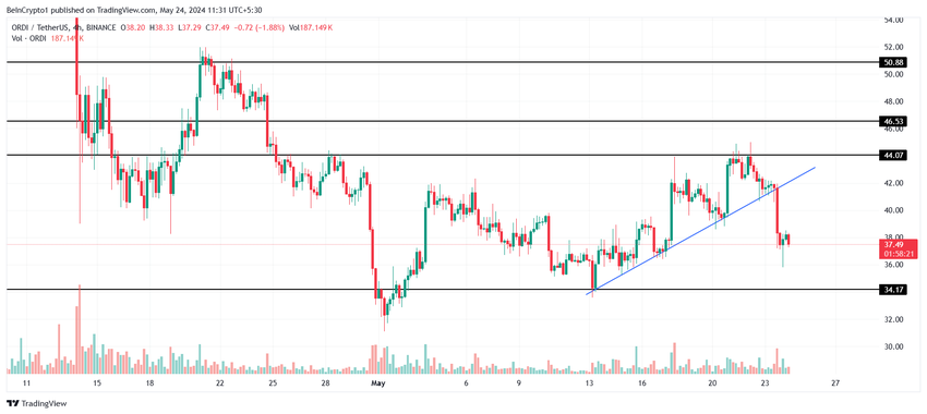 Ordinaalien hinta oli ollut nousutrendissä viimeiset kymmenen päivää, mutta laski linjan läpi viimeisen 24 tunnin aikana. Altcoin havaitsi 10 %:n laskun tämän keston aikana, minkä seurauksena ORDI vaihtoi omistajaa 37,4 dollarissa tällä hetkellä.