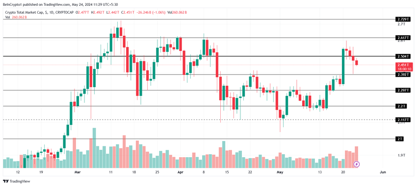 Korkeampien reaalikorkojen vuoksi edes uutiset Ethereum ETF:n spot-hyväksynnästä eivät pystyneet torjumaan laskusuuntausta, mikä johti markkinoiden yleiseen laskuun. Tämä nosto voi jatkua, ja TOTAL laskee 2,39 biljoonaan dollariin.