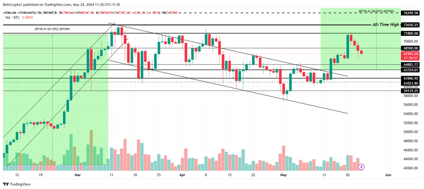 Bitcoinin hinta rekisteröi punaisen kynttilänjalan neljättä päivää peräkkäin ja laski kirjoitushetkellä 71 800 dollarista 67 293 dollariin. Kun BTC putosi alle 68 500 dollarin tuen, se laajensi sijoittajien laskusuuntaisuutta, mikä voi mahdollisesti vetää Bitcoinin alas seuraavaan ratkaisevaan 64 883 dollarin tukeen.