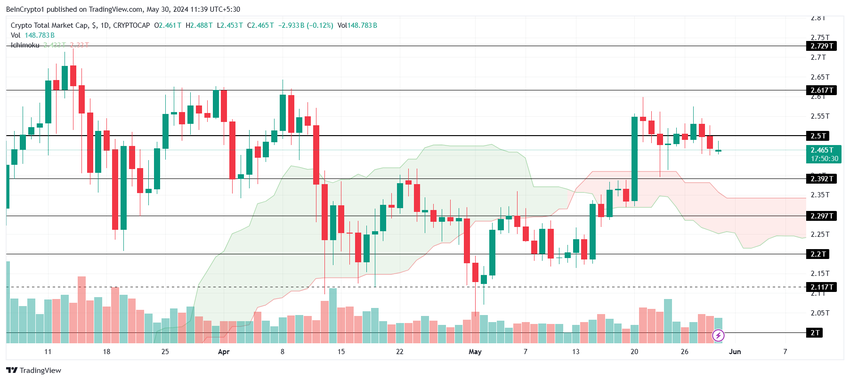 Seuraava kriittinen tuki on 2,39 biljoonaa dollaria; Nosto tähän pisteeseen tarkoittaisi 2,5 prosentin laskua, mikä on mahdollista. Tämä johtuu siitä, että Ichimoku-pilvi osoittaa laskusuuntaisuutta huolimatta siitä, että se on kynttilänjalkojen alapuolella.