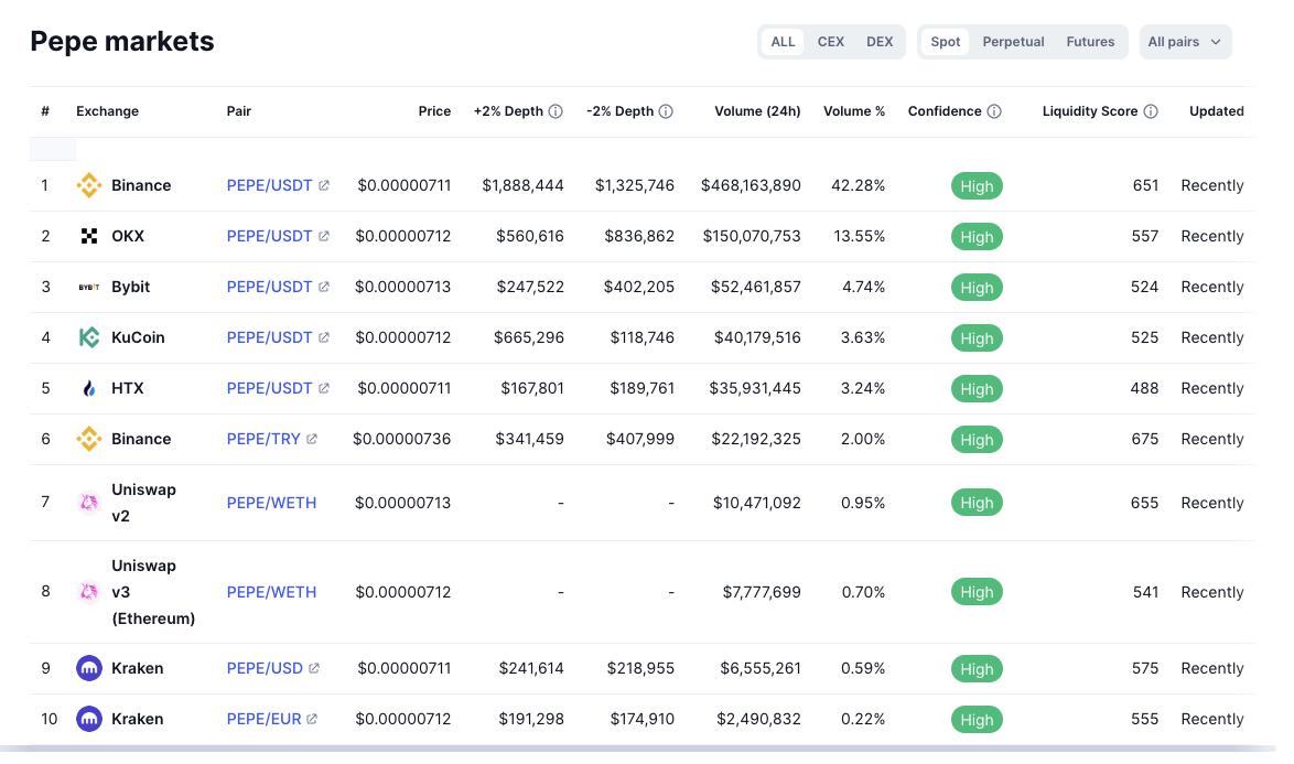 Esimerkiksi Binancessa PEPE:n hinnan siirtäminen kahdella prosentilla vaatii 1,90 miljoonan dollarin sijoituksen. Sitä vastoin pörsseissä, kuten Bybit, HTX ja Kraken, vain 300 000 dollarilla voidaan saavuttaa sama hintaliike. Tämä taktiikka on laskelmoitu manööveri, jota markkinatakaajat käyttävät voittojen saamiseksi.