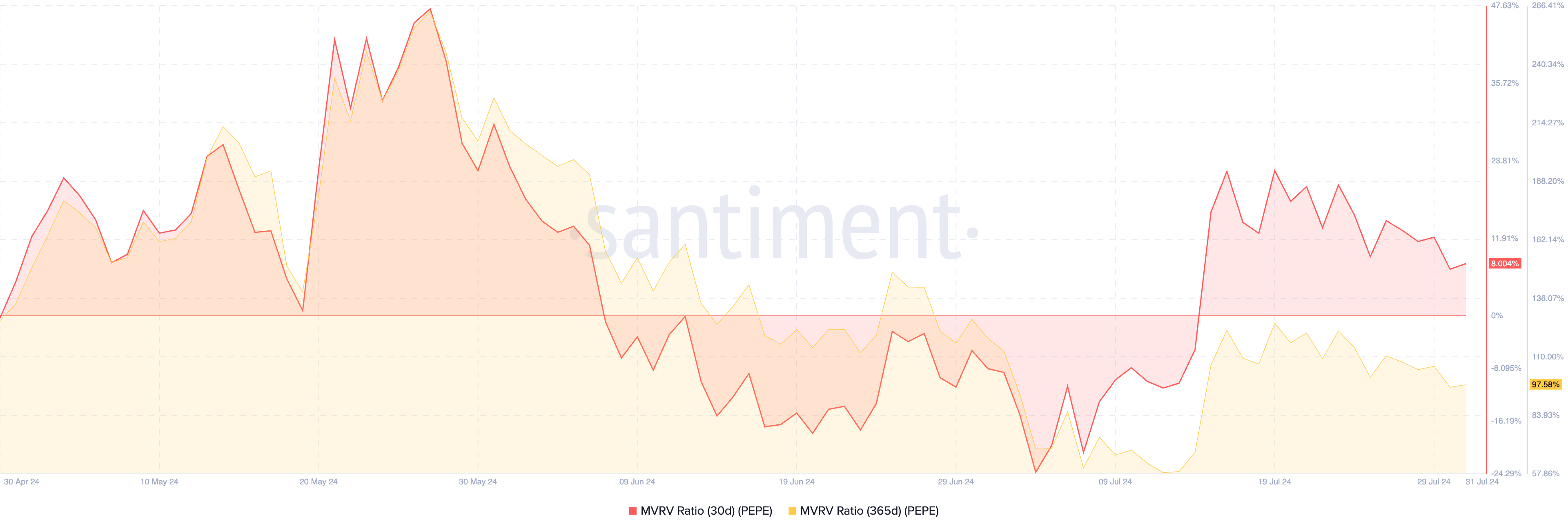 Kirjoitushetkellä PEPE:n MVRV-suhde on positiivinen, kun sitä arvioidaan eri liukuvien keskiarvojen perusteella. Erityisesti sen 30 päivän ja 365 päivän liukuvien keskiarvojen MVRV-suhteet ovat 8% ja 97,58%.