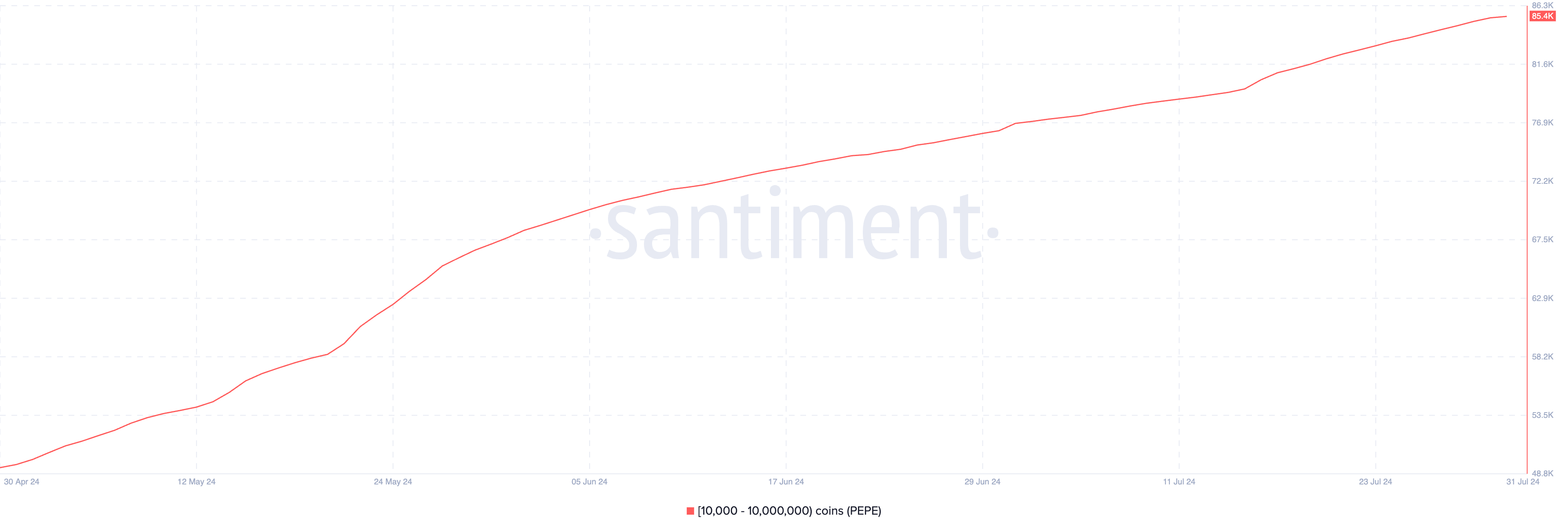 Sammakkoaiheinen meemikolikko Pepe (PEPE) on kokenut valasosoitteiden määrän kasvun. Santimentin mukaan 85 400 osoitetta nyt omistaa 10 000–10 000 000 PEPE-kolikkoa, mikä on korkein määrä sen julkaisusta huhtikuussa 2023 lähtien.