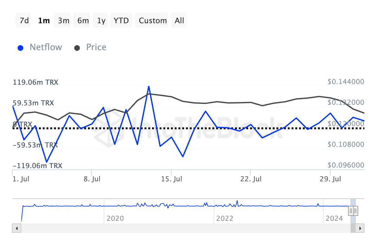 Lohkoketjutiedot IntoTheBlockista ovat paljastaneet merkittävän 243 %:n kasvun TRX:n suurten omistajien nettovirrassa viimeisen 30 päivän aikana.