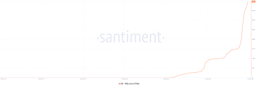 Kun haltijat ennakoivat uusia mielenosoituksia, TON:n valaat ovat tehostaneet kertymistään. Ketjun tiedot paljastavat, että 10 000 000–100 000 000 rahakketta hallussaan pitävien TON-sijoittajien määrä on kasvanut 12 % viimeisen 30 päivän aikana.