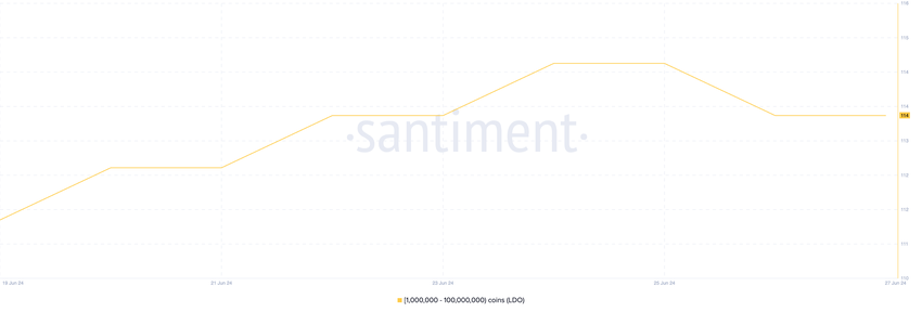 Sen LDO-valaiden, joilla on 1 000 000–100 000 000 rahaketta, määrä on noussut 2 % viimeisen viikon aikana. Tätä kirjoitettaessa tähän LDO:n haltijoiden kohorttiin kuuluu 114 sijoittajaa.