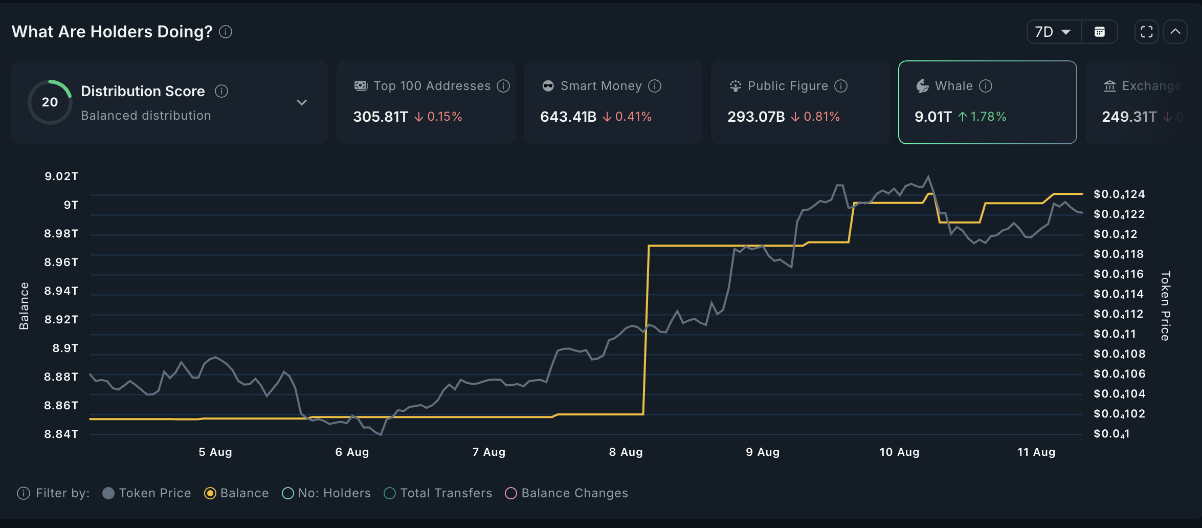 Tänä aikana yli miljoonan dollarin arvoisten tokenien haltijat ovat lisänneet PEPE-sijoituksiaan 2 %. Tätä kirjoitettaessa tämä sijoittajaryhmä omistaa 9,01 biljoonaa tokenia.