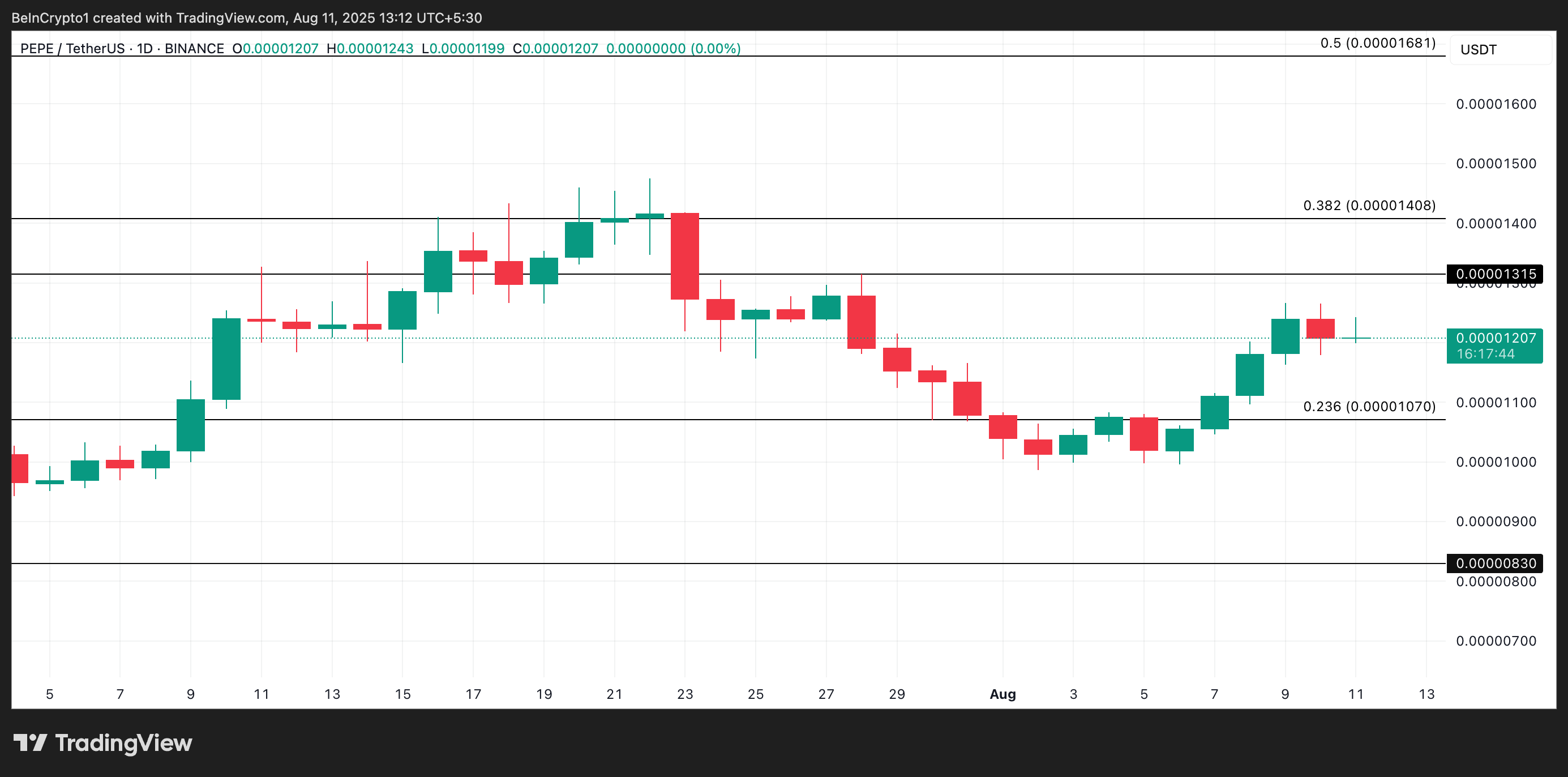 PEPE:n hinta on 0,00001207 dollaria kirjoitushetkellä, nousua 17 % viimeisen seitsemän päivän aikana. Kasvavan härkämarkkinoiden tunnelman myötä meemikolikko voisi ylläpitää hintaralliaan, jos valaiden kysyntä jatkuu.