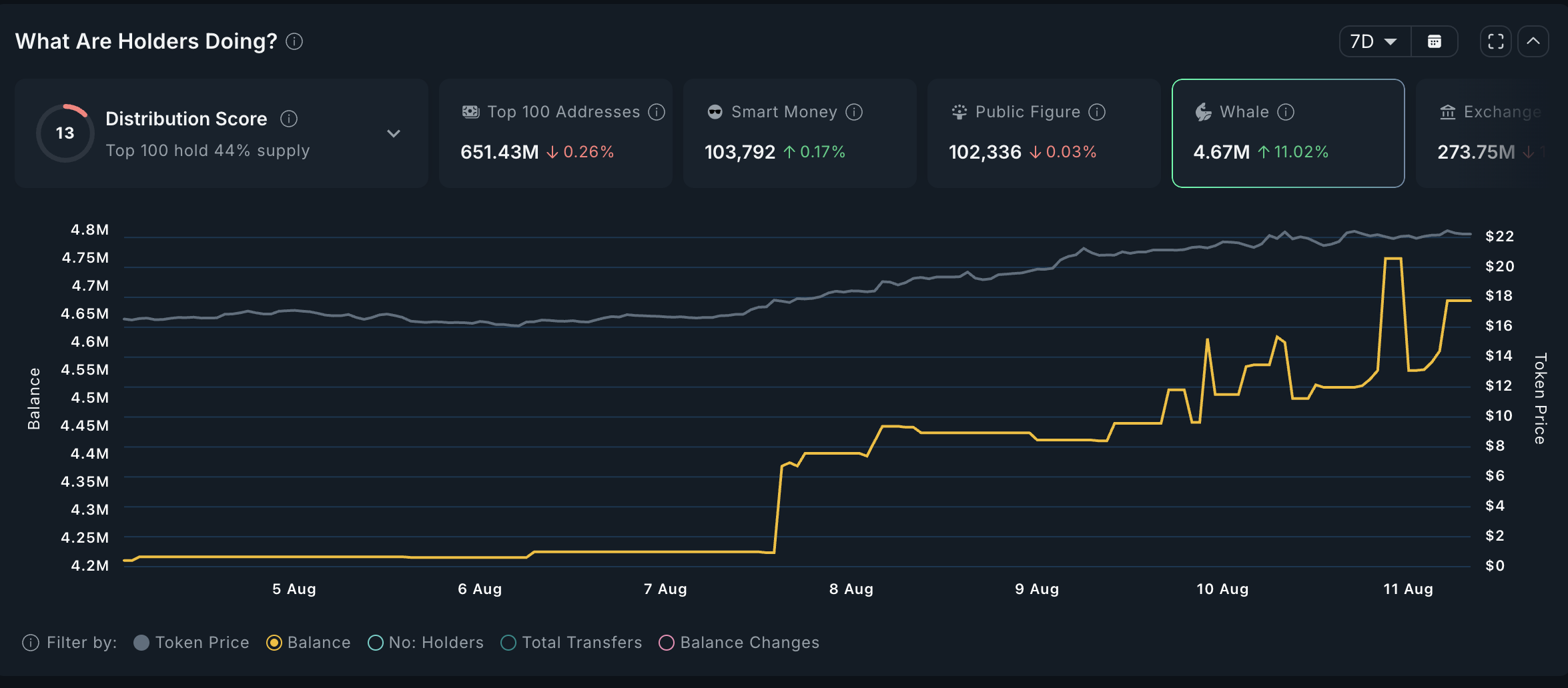 Nansenin tietojen mukaan lompakko-osoitteet, jotka pitävät yli miljoonan dollarin arvosta LINKiä, ovat kasvattaneet omistuksiaan 11 % viimeisen seitsemän päivän aikana.