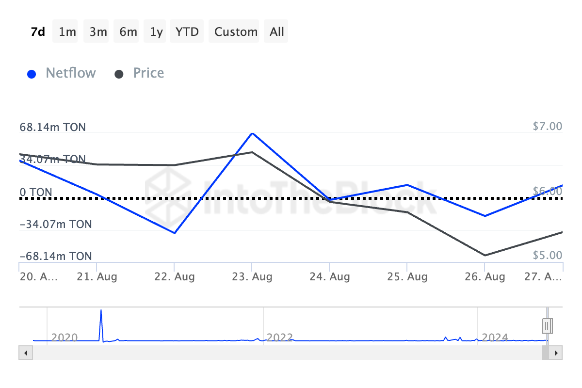 Toncoinin (TON) arvo on laskenut 21% elokuun 24. päivästä lähtien Telegramin toimitusjohtajan Pavel Durovin pidätyksen jälkeen. TON-valaat ovat hyödyntäneet tämän hintalaskun kasvattaakseen omistuksiaan, mikä näkyy 307% nousuna suurten omistajien nettovirrassa IntoTheBlockin mukaan.