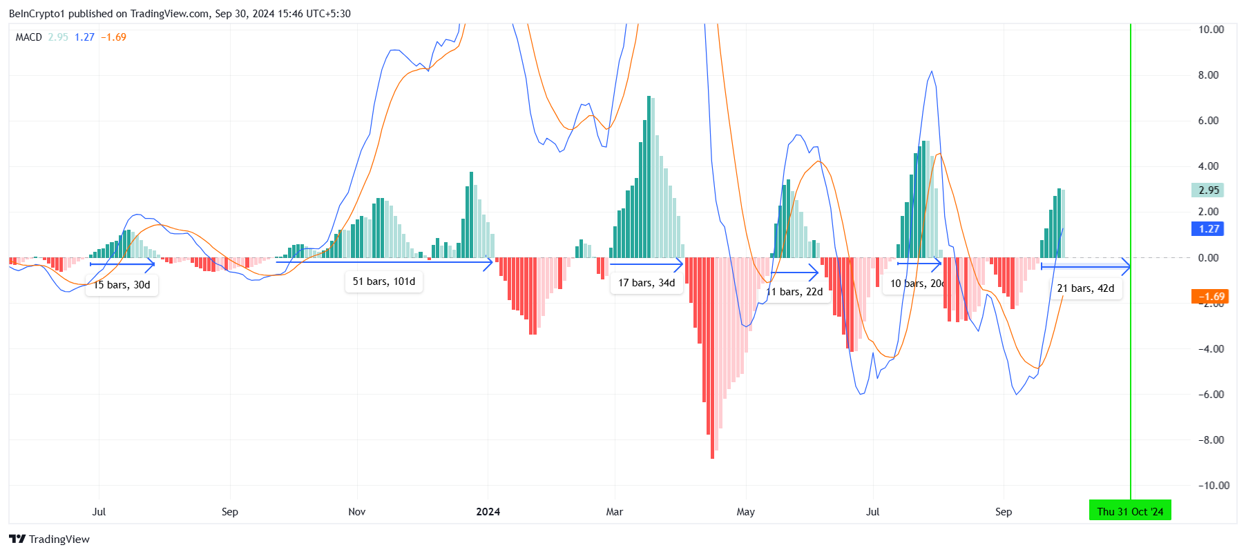 Lisäksi makrotaloudellinen vauhti Solanalle näyttää positiivisia merkkejä. Liukuvan keskiarvon konvergenssi-divergenssi (MACD) -indikaattori viittaa siihen, että härkämäinen vauhti on kasvanut syyskuun lopusta lähtien. Tämän vauhdin odotetaan kestävän 42 päivää, antaen SOL:lle riittävästi tilaa nousta merkittävästi lokakuussa.