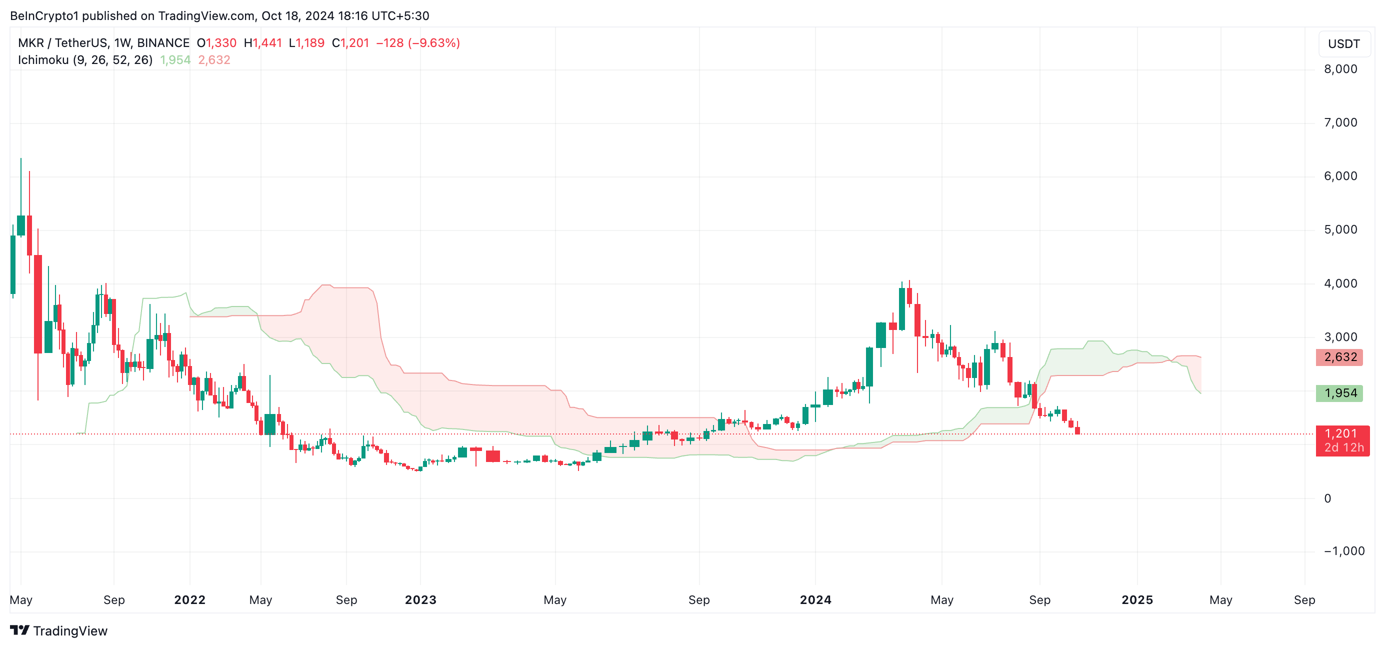 Elokuusta lähtien MKR on käynyt kauppaa Ichimoku-pilvensä alapuolella. Tämä indikaattori seuraa markkinatrendien liikettä ja tunnistaa mahdolliset tuki-/vastustasot.