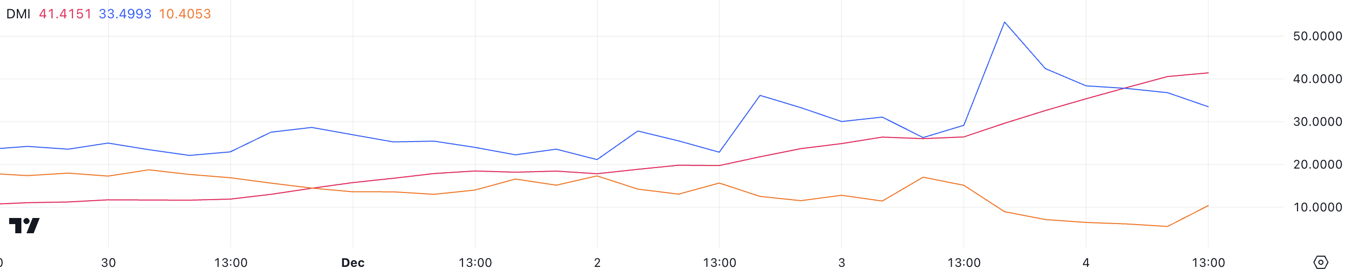 Monero DMI-kaavio paljastaa vahvan trendin, kun sen ADX on noussut 41,4:ään, kun se oli vain päivää aiemmin alle 30, mikä tekee siitä yhden suurimmista nousijoista altcoineista.