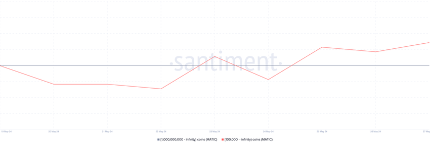 MATICin tarjonnan jakautumisen arviointi osoitti nousua valaissa, joilla oli yli 100 000 rahaketta. Pelkästään viime viikolla tämä sijoittajakohortti kasvoi 1,2 prosenttia.