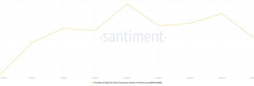 MATIC-valaiden määrän kasvu tänä aikana voi johtua siitä, kuinka kannattavia altcoiniin liittyvät liiketoimet ovat olleet. Lisäksi arvio MATIC-transaktiovolyymin päivittäisestä suhteesta tulokseen ja tappioon (käyttäen seitsemän päivän liukuvaa keskiarvoa) oli 1,03.