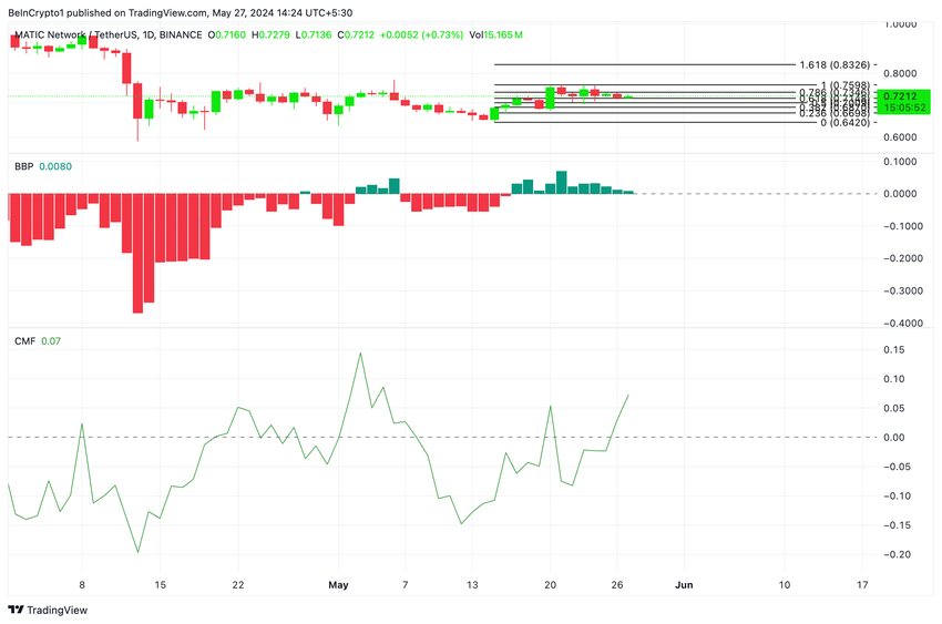 Lehdistöhetken nousutrendissä MATICin Chaikin Money Flow’n (CMF) arvo oli 0,07. Tämä indikaattori mittaa omaisuuserän hintaliikkeen taustalla olevaa osto- ja myyntipainetta.