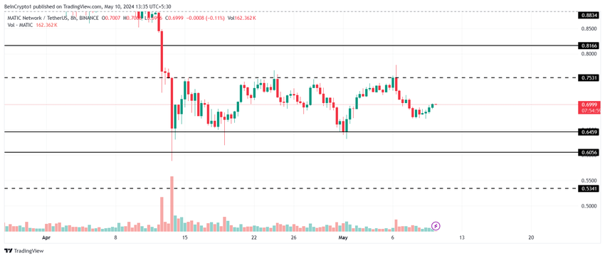 MATICin viimeisen kuukauden hinta on konsolidoitu 0,65–0,75 dollarin välille. Näitä alueita on testattu aiemmin tukena ja vastuksena, ja ne pysyvät edelleen sellaisina.