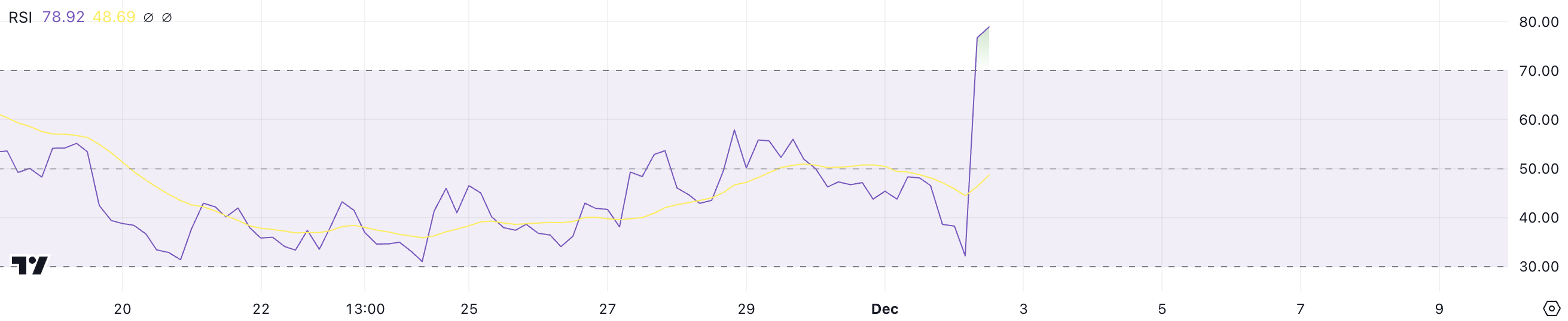 MOODENG suhteellinen voimaindeksi (RSI) nousi 32:sta lähes 80:een vain muutamassa tunnissa viimeaikaisen hinnannousun jälkeen.
