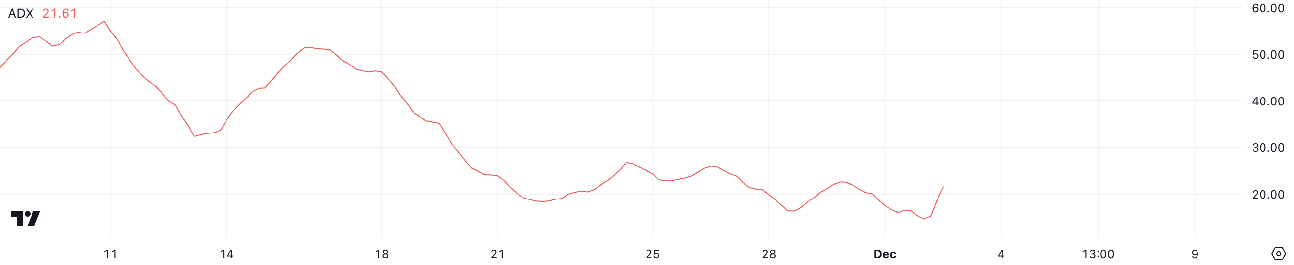 MOODENG:n ADX-arvo 21,6 viittaa mahdollisesti vahvan suuntaliikkeen syntymiseen, mikä viittaa siihen, että viimeaikainen hinnannousu saattaa jatkua markkinoiden luodessa selvempää trendiä Coinbasen ilmoituksen jälkeen.