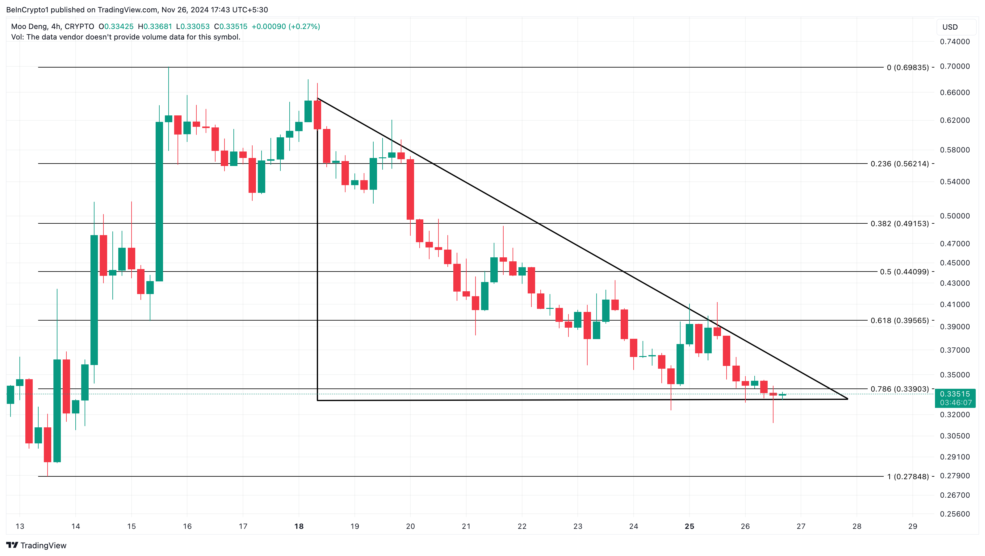 4-tunnin kaaviossa MOODENG jatkaa kaupankäyntiä laskevassa kolmiossa. Laskeva kolmio on bearish kaaviokuvio, jota käytetään yleisesti teknisessä analyysissä. Se määritellään alaspäin kaltevalla ylätrendiviivalla ja tasaisella, vaakasuoralla alatrendiviivalla, joka toimii tukitasona.