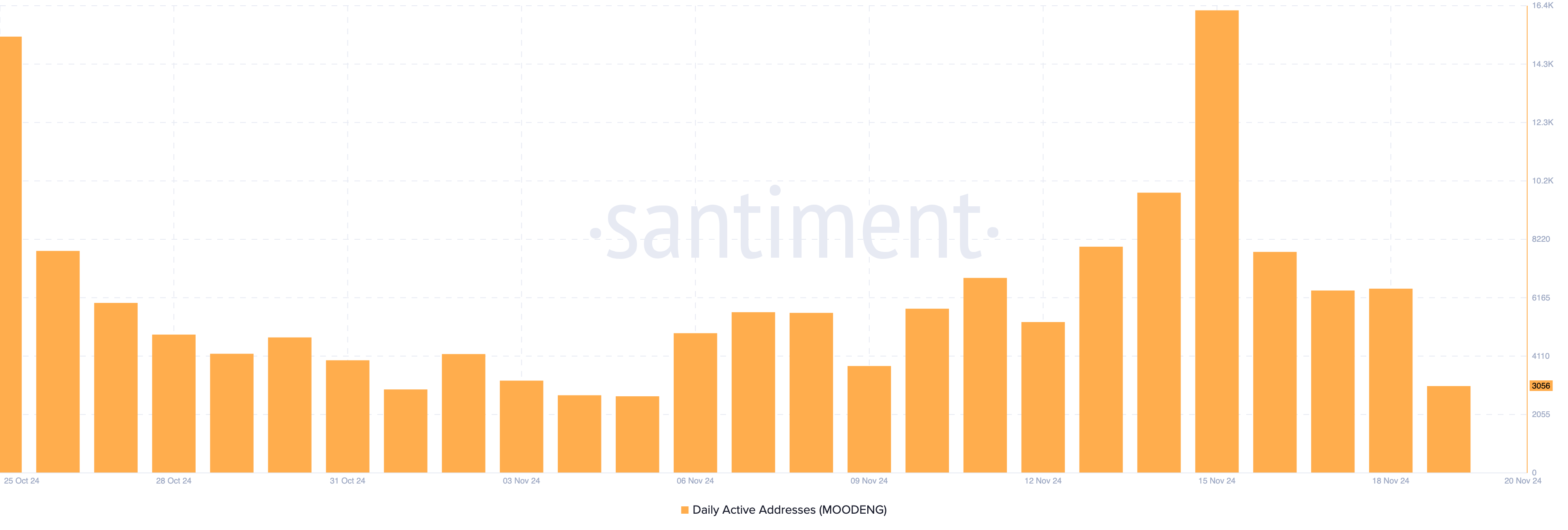 Huolimatta kertymisestä, Santimentin on-chain -data korostaa merkittävää laskua Moo Dengin päivittäisissä aktiivisissa osoitteissa. Aktiiviset osoitteet edustavat osallistujia — joko lähettäjiä tai vastaanottajia — onnistuneissa tapahtumissa. Yleensä aktiivisten osoitteiden lisääntyminen viittaa kasvavaan käyttäjävuorovaikutukseen, mikä on bullish indikaattori.