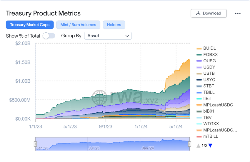 Kun reaalimaailman omaisuuden tokenisointiteollisuus on kasvanut, T-setelit ovat olleet suosittuja monille liikkeeseenlaskijoille, mukaan lukien Franklin Templeton ja BlackRock. RWA.xyz tietojen mukaan tokenisoitujen treasury-tuotteiden kokonaismarkkina-arvo on 1,55 miljardia dollaria 18. kesäkuuta. Tämä luku edustaa noin 14,26 prosentin kasvua viimeisen 30 päivän aikana.