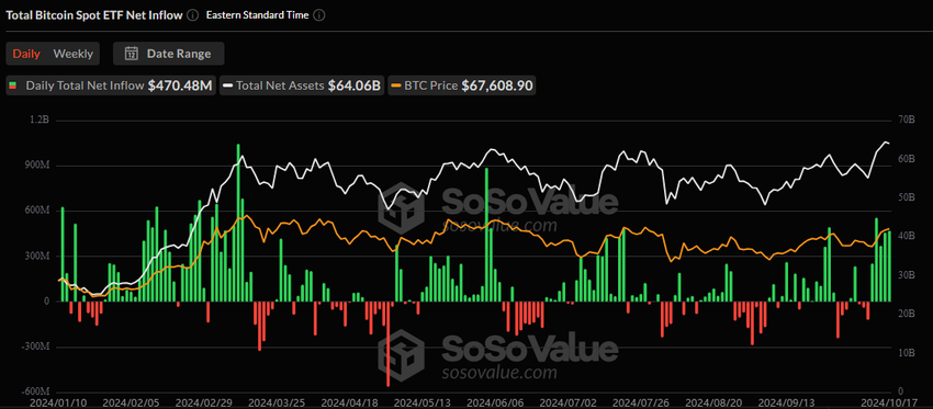 Esimerkiksi 14. lokakuuta Bitcoin ETF -markkina kirjasi korkeimman päivittäisen sijoituksensa, 555,86 miljoonaa dollaria, sitten 4. kesäkuuta. Tämä korostaa kasvavaa kysyntää sijoittajilta.