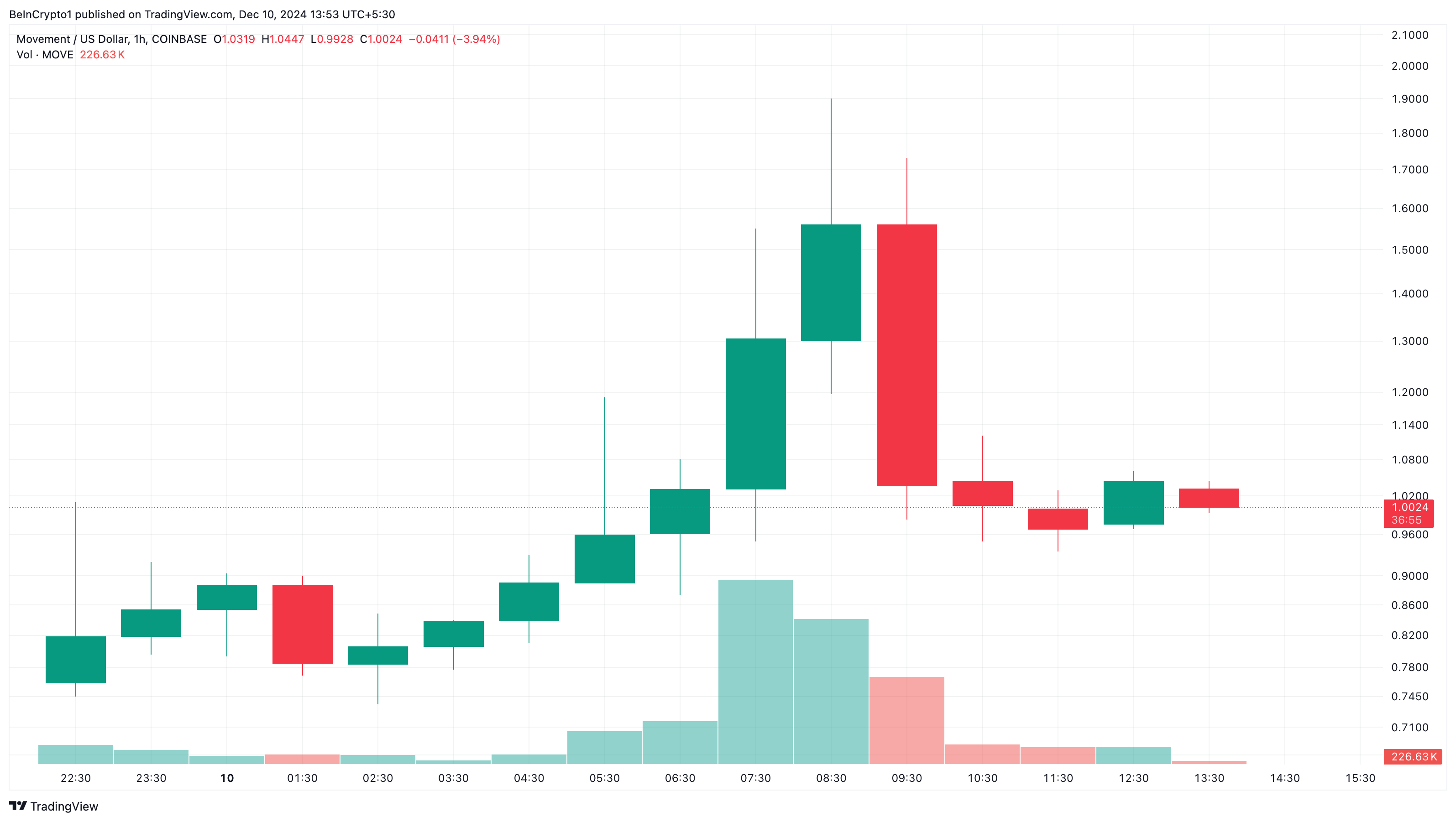 Kun se lanseerattiin eilen, MOVE-tokenin hinta oli noin 0,71 dollaria. Mutta mainitun nousun ansiosta kryptovaluutan arvo on noussut yli 1 dollarin tätä kirjoitettaessa.