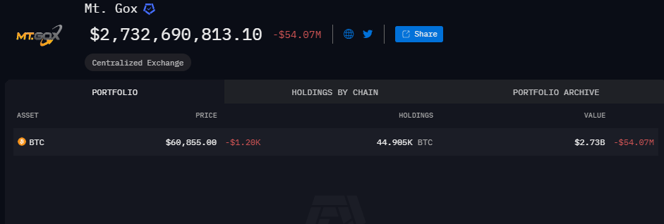 Arkhamin mukaan Mt. Goxin nykyinen lompakko sisältää 44 905 Bitcoinia, joiden arvo on yli 2,7 miljardia dollaria.