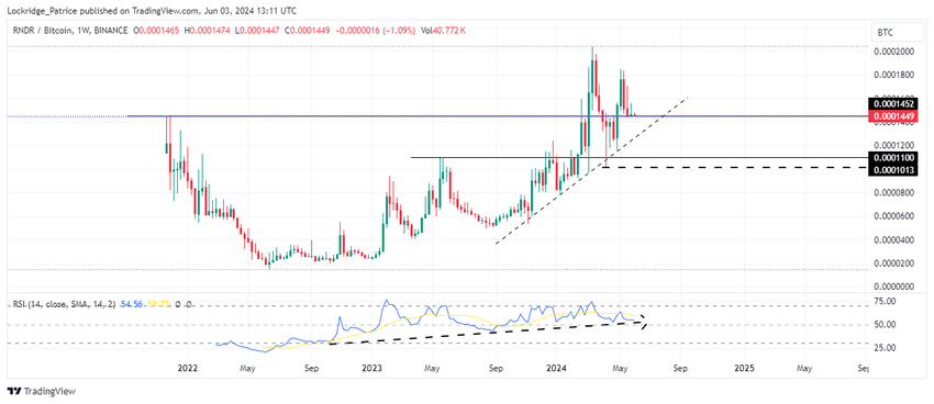 Altcoinin hinta on jatkuvasti noussut ja pysyy nousevan trendiviivan yläpuolella, mikä osoittaa nousun mahdollisuuden. Suhteellisen voimaindeksin (RSI) korkeammat pohjat tukevat näitä näkymiä, mikä viittaa RNDR-markkinoiden nousuvauhdin jatkumiseen.