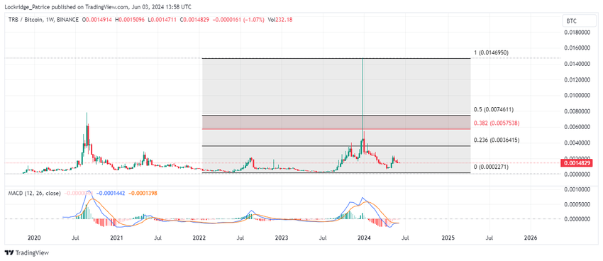 Tellor to BTC -hinta nousi huippuunsa 0,014:ään joulukuussa 2023 laskeuduttuaan 0,00022:n syvyyteen välittömästi FTX:n romahduksen jälkeen. Huippu kuitenkin hylättiin pian sen jälkeen, ja nyt TRB:n hinta on palannut FTX:n romahdusta edeltäneen tason alapuolelle.