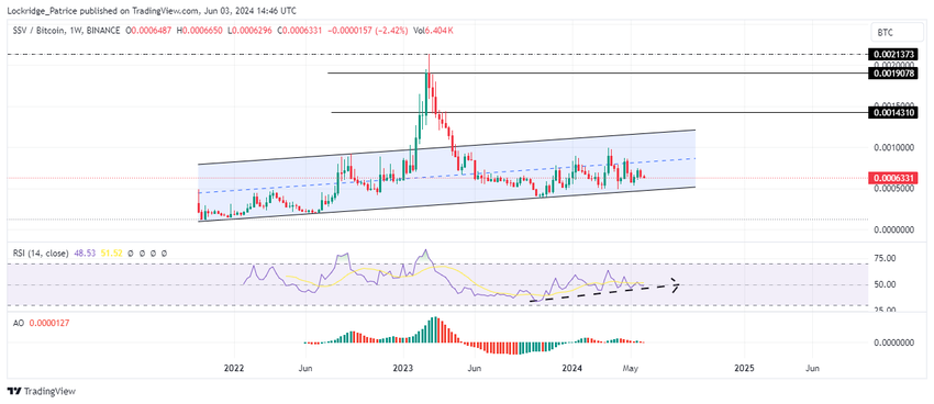 ssv.network-härät pyrkivät saamaan lisää voittoja, ja SSV/BTC-kauppapari konsolidoituu nousevaan rinnakkaiskanavaan. RSI:n korkeammat pohjat tukevat näitä näkymiä, ja SSV:n hinta todennäköisesti kirjaa enemmän voittoja nousuvauhdin vallitessa.