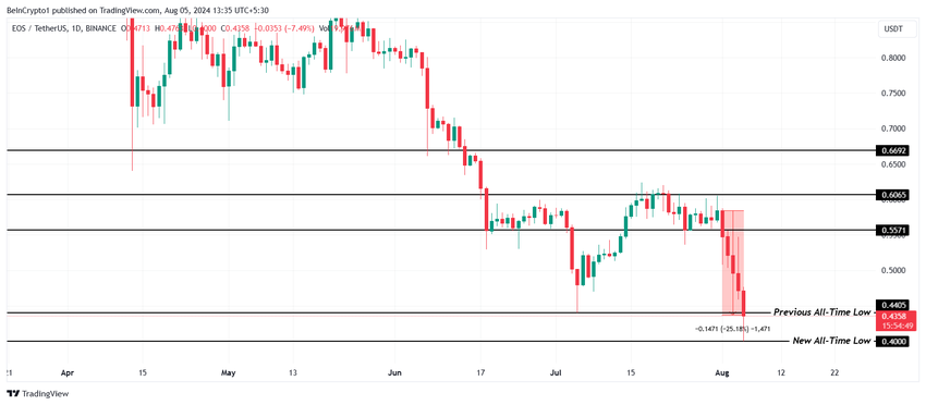 Vaikka EOS:n hinta ei olekaan laskenut jyrkästi viime päivänä, viime viikon jatkuva lasku on vaikuttanut uuteen ATL:ään. Viidessä päivässä altcoin laski 25%, ja sen hinta kirjoitushetkellä on 0,43 dollaria.