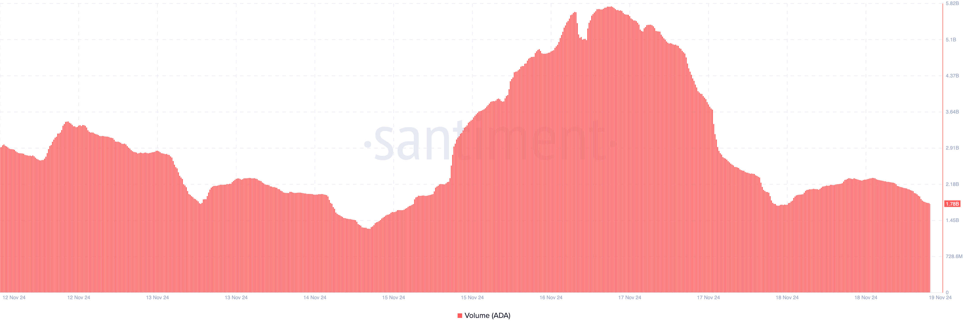 Toinen tunnusluku, joka tukee Cardanon hinnan mahdollista laskua, on kaupankäyntivolyymien lasku. Marraskuun 16. päivänä Cardanon volyymi oli lähes 6 miljardia dollaria. Kuitenkin, Santimentin ketjuanalyysin mukaan, se on sittemmin laskenut merkittävästi 1,78 miljardiin dollariin.