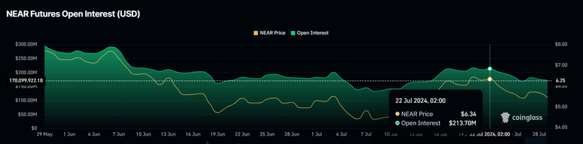 Lisäksi NEARin Open Interest on laskenut merkittävästi. Viime viikon aikana se on laskenut 20 %, 213 miljoonasta dollarista 170 miljoonaan dollariin.