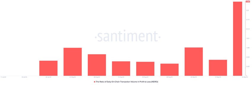 Tämä hintaralli on merkittävästi lisännyt kannattavien NEIRO-transaktioiden määrää. Santimentin tiedot osoittavat, että voitollisten ja tappiollisten transaktiovolyymien suhde on nyt 3,66, mikä on korkein luku tokenin heinäkuun lanseerauksesta lähtien. Tämä tarkoittaa, että jokaista tappiollista transaktiota kohden 3,66 on tuottanut voittoa.
