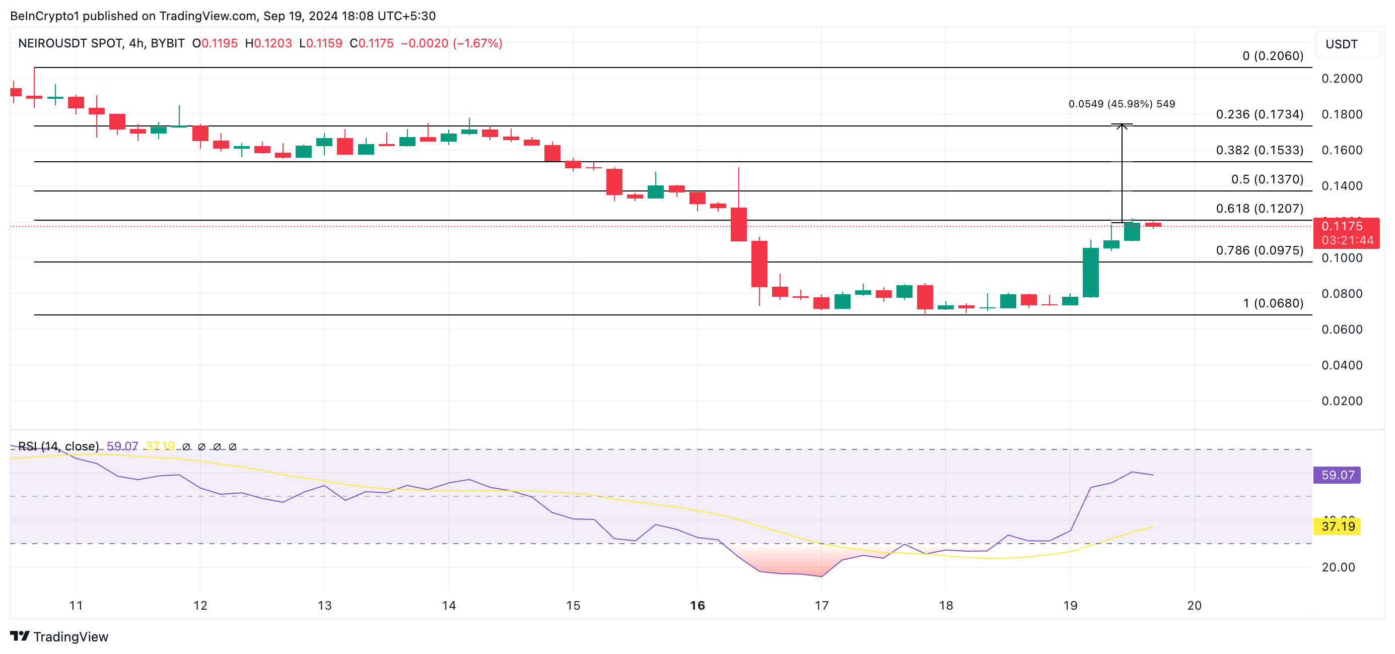 NEIRO:n suhteellinen vahvuusindeksi (RSI) neljän tunnin kaaviossa vahvistaa altcoinin kasvavan kertymisen. 59,07:n arvolla tämä momentti-indikaattori viittaa siihen, että markkinaolosuhteet kallistuvat ostamisen puolelle myymisen sijaan.