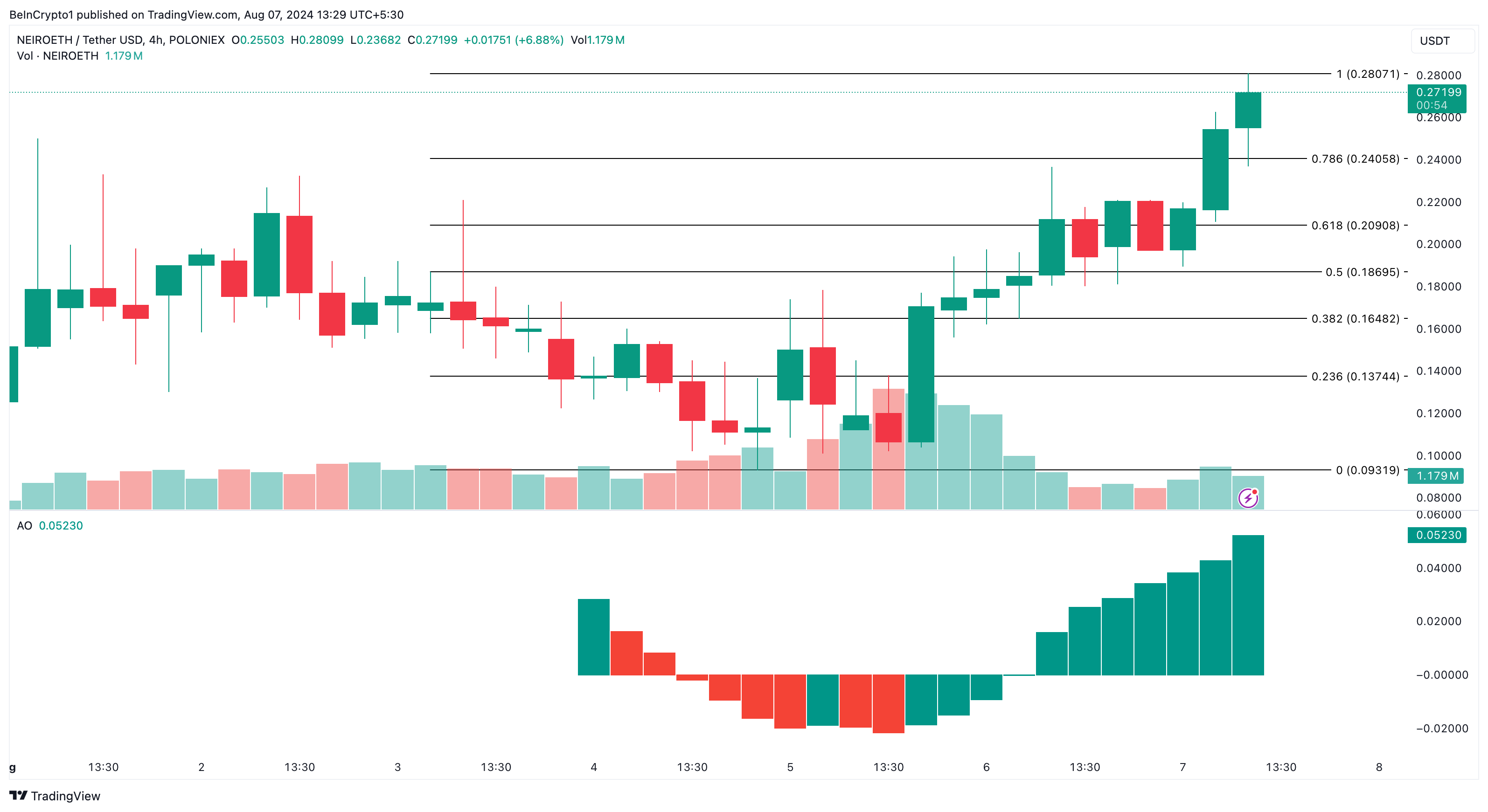4 tunnin kaavion perusteella NEIRO vaikuttaa valmiilta saavuttamaan uusia huippuja, kunhan se kokee kasvavaa ylöspäin suuntautuvaa liikettä. Awesome Oscillator (AO) on yksi indikaattori, joka tukee tätä käsitystä.