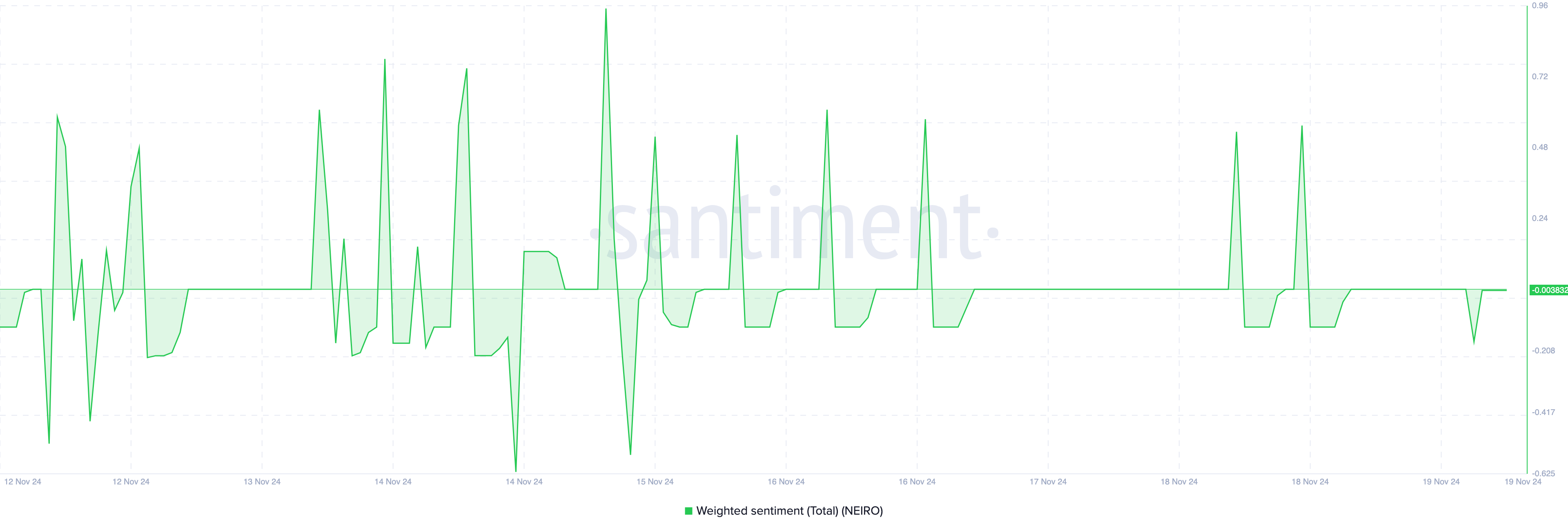 Lisäksi NEIRO kokee nousua Painotetussa Tunnelmassa, tunnusluvussa, joka kuvaa markkinaosallistujien yleistä käsitystä kryptovaluutasta. Nouseva tunnelma viittaa kasvavaan härkämäiseen kommentointiin, kun taas lasku heijastaa negatiivisia markkinanäkemyksiä.