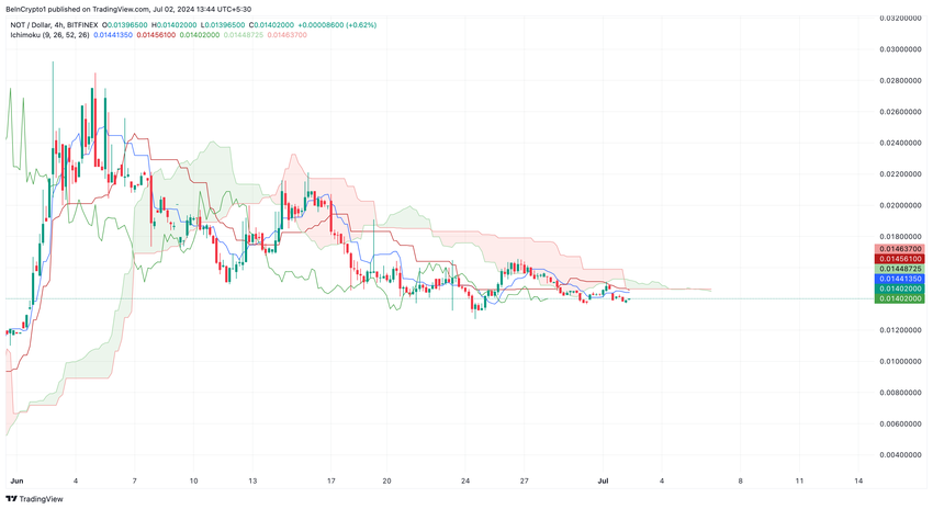 Nousevasta potentiaalista huolimatta Ichimoku Cloud osoittaa, että NOT voi kohdata vastustusta, kun se yrittää poistaa joitain viimeaikaisista tappioistaan. Ichimoku Cloud on tekninen työkalu, joka mittaa vauhtia ja trendin suuntaa.