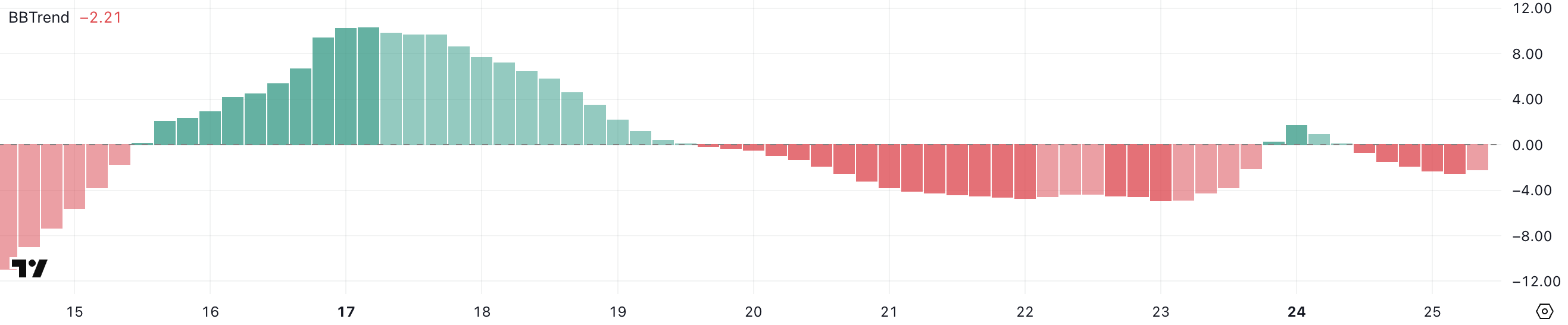 TRUMPin BBTrend on tällä hetkellä -2,21, kun se eilen hetkellisesti kääntyi positiiviseksi, mutta laski takaisin ja saavutti äskettäin negatiivisen alarajan -2,50 vain muutama tunti sitten. BBTrend, eli Bollinger Band Trend, on tekninen indikaattori, jota käytetään arvioimaan trendin vahvuutta ja suuntaa.