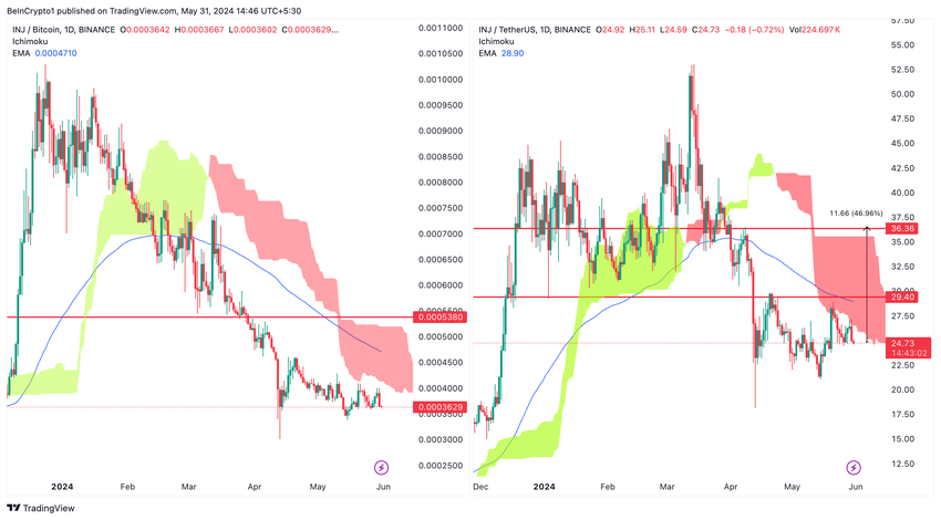 INJ/BTC-kaavio paljastaa pitkittyneen laskutrendin, jossa on toistuvia epäonnistumisia päivittäisen Ichimoku Cloudin ja 100D EMA:n ylittämisessä. Hinta testaa tällä hetkellä tukitasoa, mikä osoittaa purkautumisen mahdollisuuden.