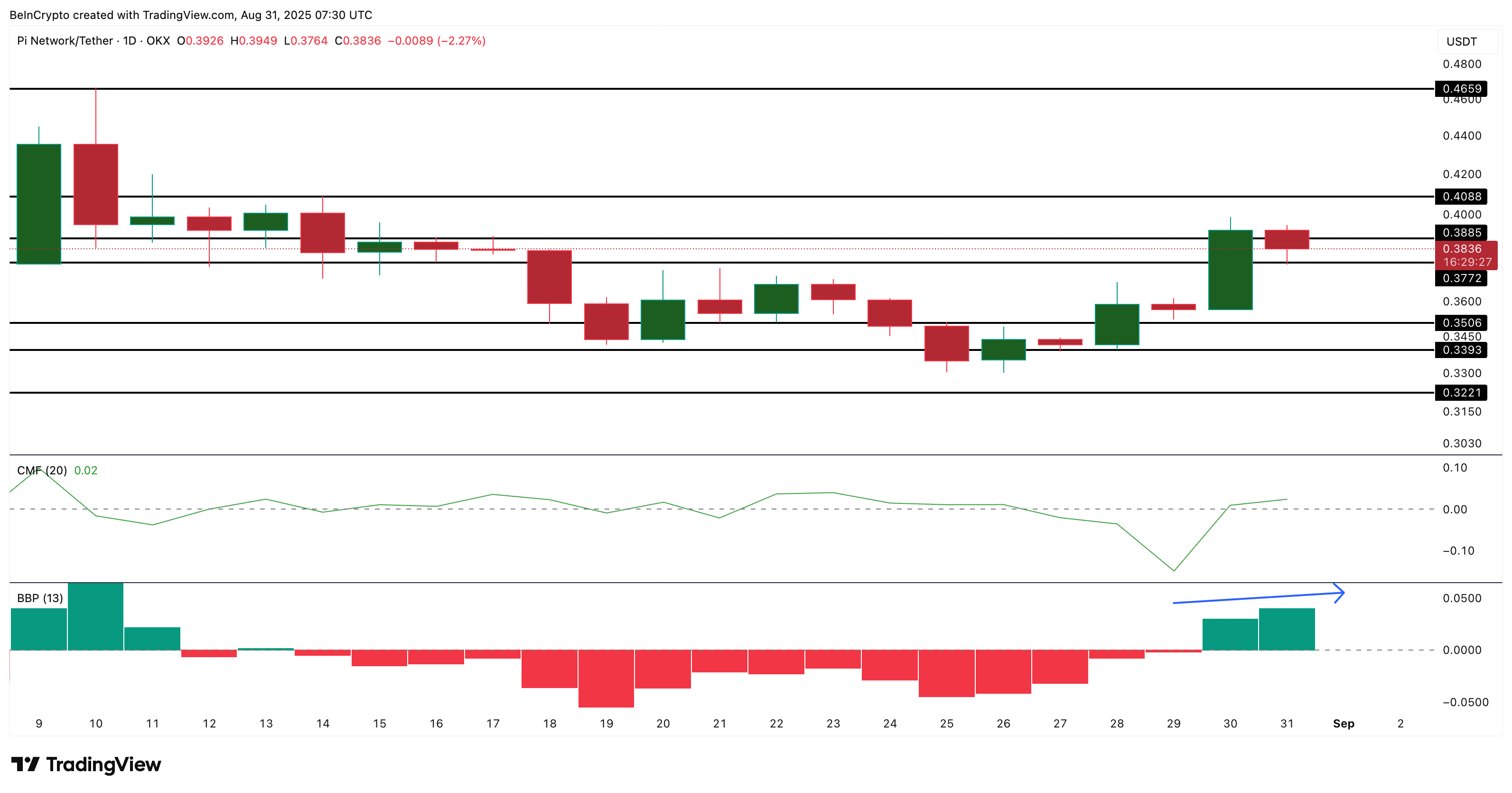 Pi Coin (PI) on ollut yksi vuoden 2025 alisuorittajista. Token on laskenut 4,7% viime kuukauden aikana, noussut 8% viime viikolla, mutta on silti laskenut yli 55% vuodessa. 0,38 dollarin hinnalla laajempi rakenne pysyy laskusuuntaisena, mutta syyskuu voi pitää kauppiaat kiinnostuneina lyhyen aikavälin piikeistä.
