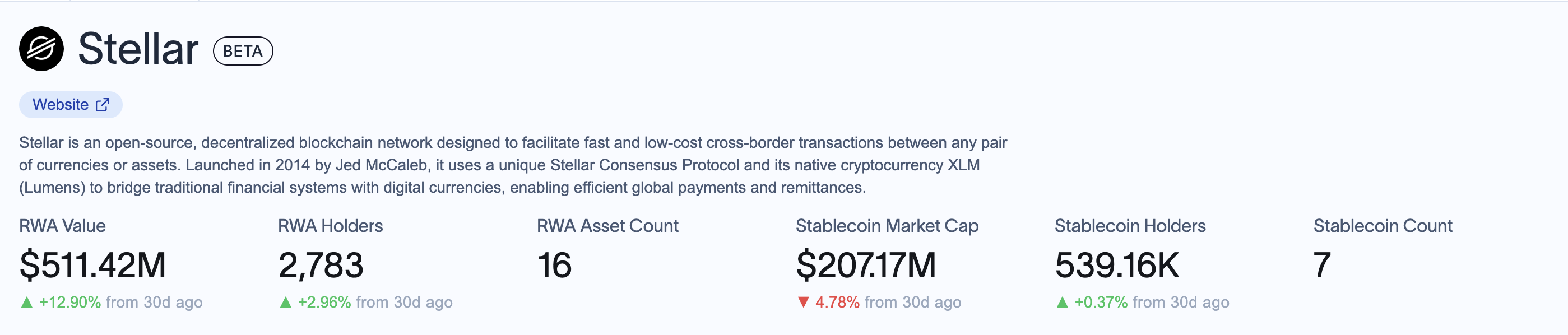 Suurin ajuri on sen Reaali-maailman omaisuuserien (RWA) kasvu, joka nousi 12,9% viimeisen 30 päivän aikana arvoon 511,42 miljoonaa dollaria. Tämä tekee Stellarista yhden harvoista suurista projekteista, jotka päättävät elokuun positiivisella pohjalla.