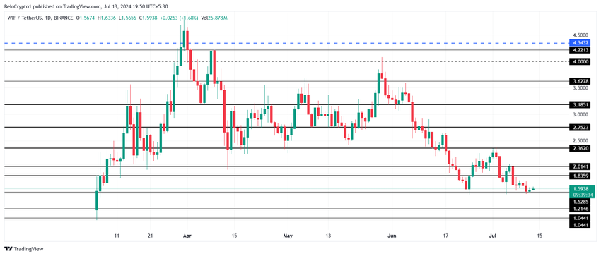 WIF:n hinta tarkastelee mahdollista elpymistä sen jälkeen, kun tuki on pomppinut 1,52 dollarissa. Tällä hetkellä omistajaa vaihtava 1,59 dollarissa, seuraava vastus on 1,83 dollarissa. Sijoittajien mahdollisuudet työntää meemikolikko tähän esteeseen ovat korkeat, kun otetaan huomioon verkossa havaitut nousevat vihjeet.