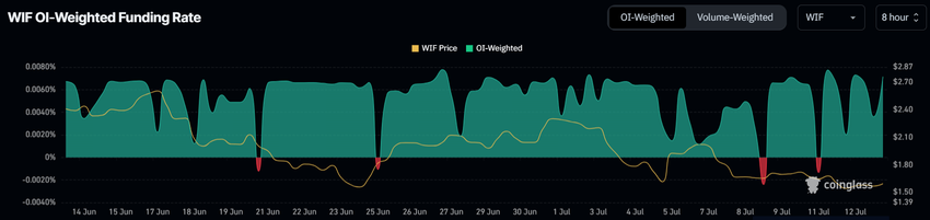 Lisäksi WIF:n positiivinen rahoitusaste on toinen rohkaiseva indikaattori meemikolikolle. Lähes negatiivisiin korkoihin painunut rahoituskorko on pomppinut takaisin, mikä on merkki parantuneesta markkinatilanteesta. Positiivinen rahoitusaste tarkoittaa, että kauppiaat ovat valmiita maksamaan preemion pitääkseen pitkiä positioita, mikä heijastaa optimismia WIF:n tulevasta suorituskyvystä.