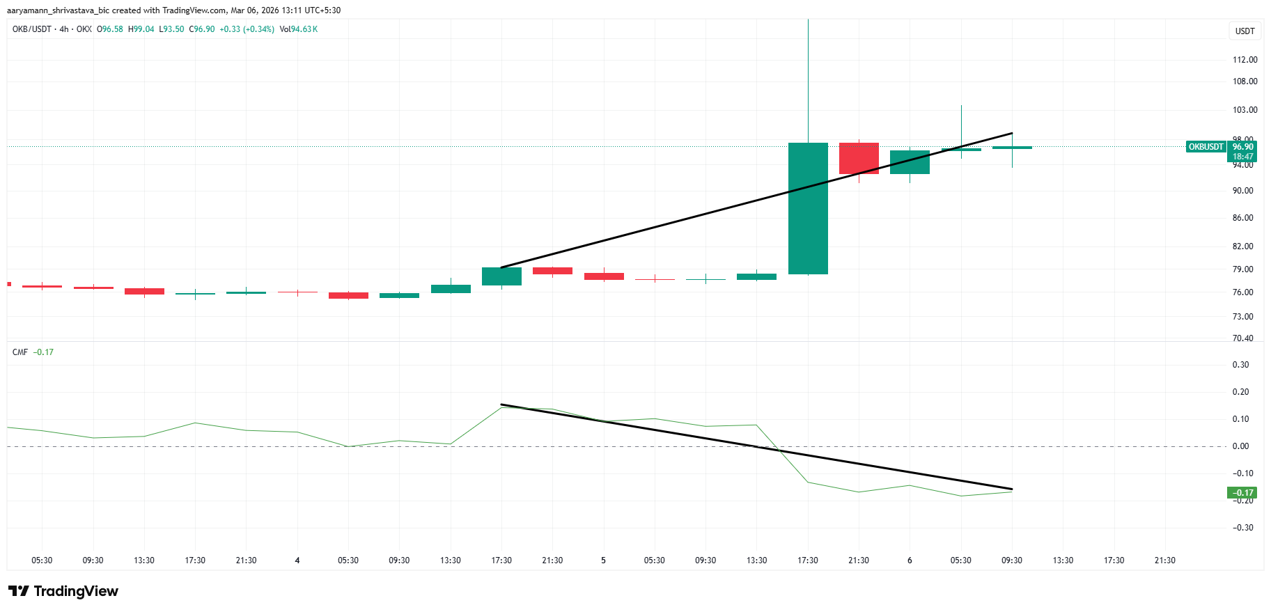 OKB:n laajempi markkinatunnelma on ristiriitainen. Chaikin Money Flow (CMF) -indikaattori, joka seuraa pääoman liikettä omaisuuseriin ja pois, osoittaa että OKB:n hinta teki korkeampia huippuja, mutta CMF muodostaa matalampia huippuja. Tällainen laskeva divergenssi viittaa siihen, ettei rallia tue vahvat pääomavirrat, vaan spekulaatio.